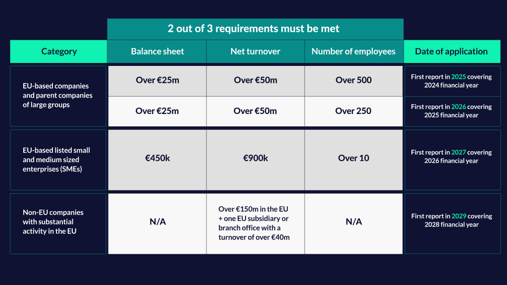 Die Richtlinie gilt für große EU-Unternehmen, börsennotierte KMU und Nicht-EU-Unternehmen, die in der EU in erheblichem Umfang tätig sind, und zwar auf der Grundlage von gestaffelten Umsetzungszeitplänen.
