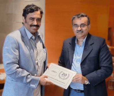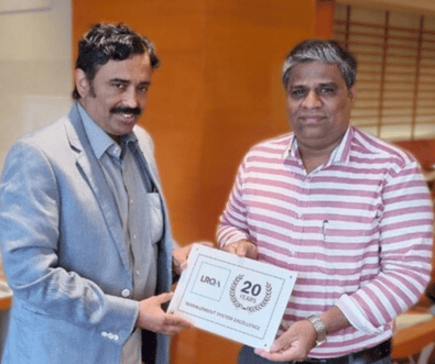 LRQA presents the 20-year award to Mr. Rajamani, Whole Time Director, Simpson & Co. Ltd, for excellence in QMS & EMS management systems.