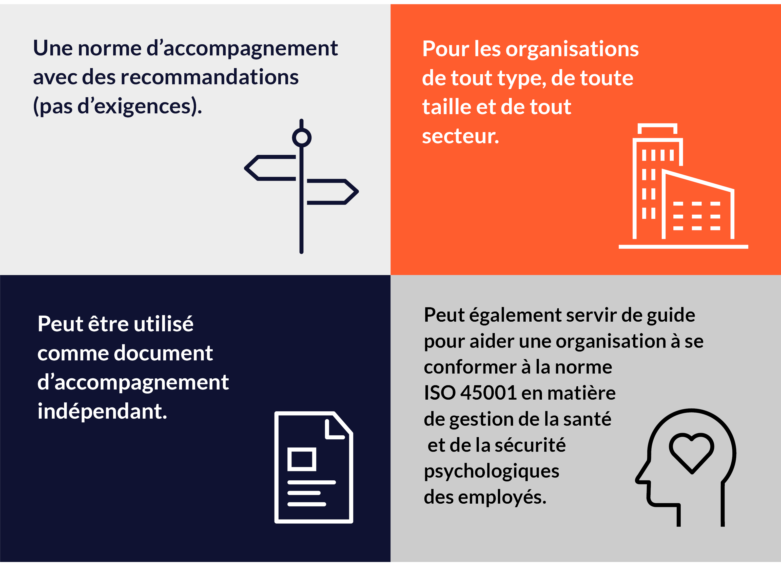 Publiée en 2021, la norme ISO 45003 est la première norme internationale dans le domaine de la santé mentale, de la sécurité et du bien-être au travail. ISO 45003 est une norme d'orientation contenant des recommandations (et non des exigences) destinées aux organisations de tout type, de toute taille et de tout secteur. Elle peut être utilisée comme document d'orientation autonome ou comme guide pour aider une organisation à se conformer aux exigences de la norme ISO 45001 en matière de gestion de la santé mentale et de la sécurité des travailleurs.