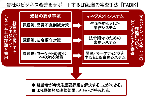 これまでの定期審査をより進化させたのが、ビジネス課題重点審査「FABIK」。 組織が真に重要と捉えていることに焦点を当て、組織のマネジメントシステムの適合性のみならず有効性も判断し、顧客のビジネスをより確かにすることを支援する審査です。