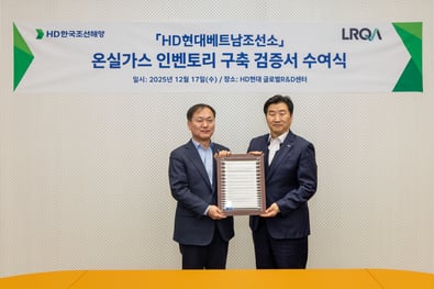 12월 17일, HD현대 글로벌 R&D 센터(GRC)에서 김형관 HD 한국조선해양 대표이사를 포함한 주요 관계자가 함께한 가운데 HD현대베트남조선 온실가스 인벤토리 구축 관련 검증의견서 전달서를 전달했습니다.