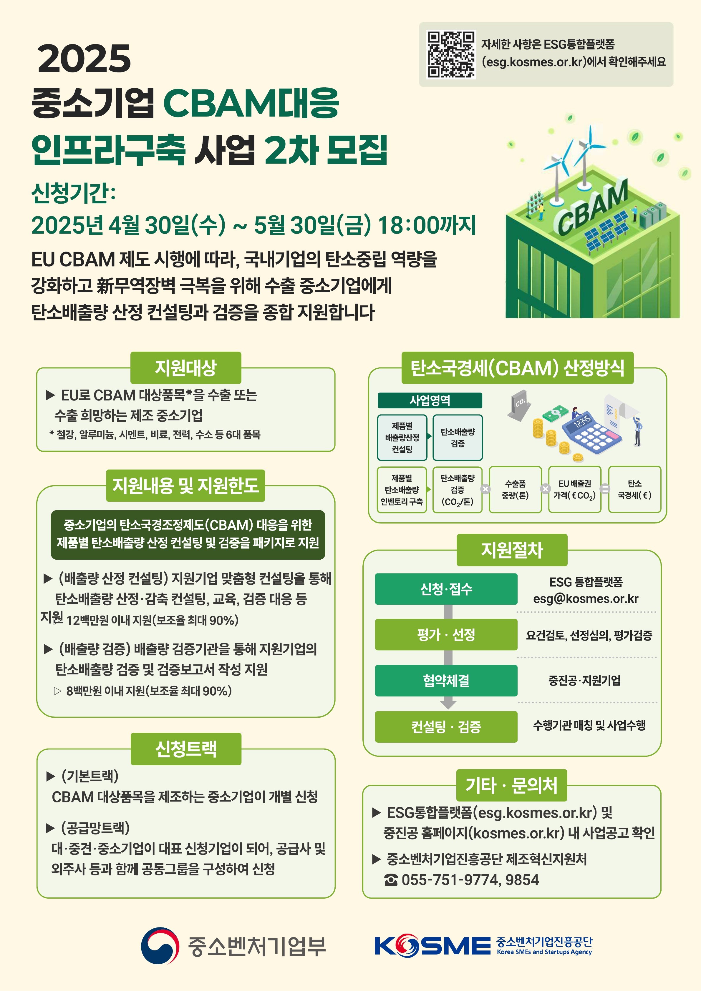 EU의 탄소국경조정제도(CBAM)에 대응해 수출기업의 경쟁력을 높이기 위한 2025년도 중소기업 CBAM 대응 인프라 구축 사업 참여기업 모집이 시작되었습니다. 이번 사업은 중소벤처기업진흥공단이 주관하며, CBAM 부담금 절감과 탄소감축을 위한 검증 비용 일부를 지원합니다. CBAM 대응이 필요한 기업에게 실질적인 도움이 될 수 있는 기회입니다.