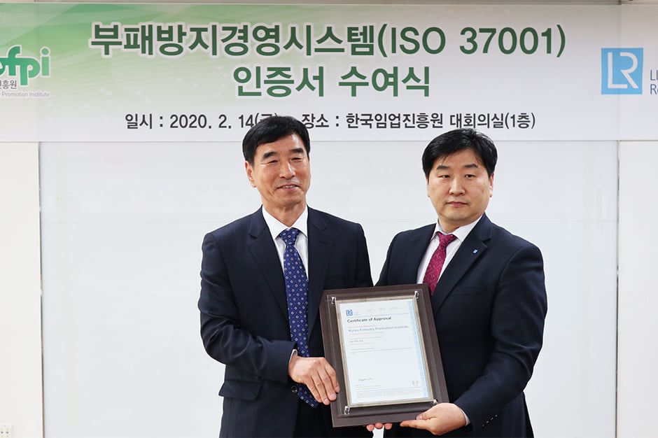 ISO 37001 인증을 기념하기 위해 인증수여식이 2월 14일, 서울에 위치한 한국임업진흥원 본사에서 진행되었습니다.